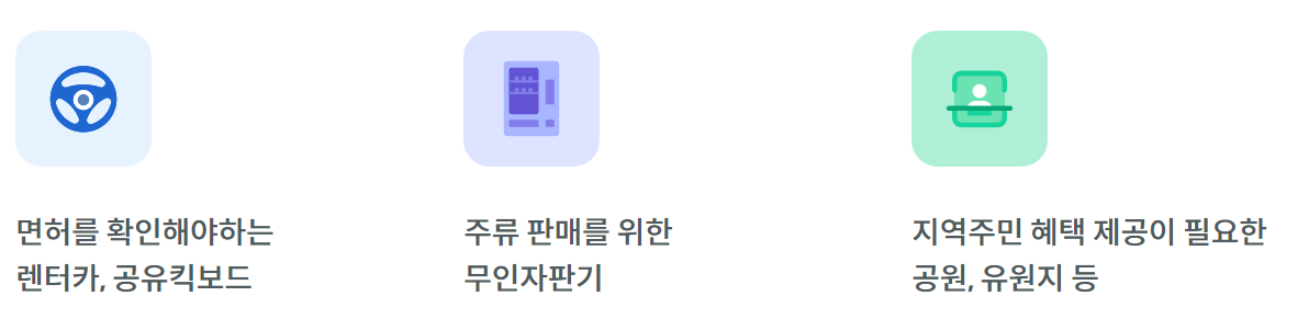 모바일 면허증(신분증)은 온라인과 오프라인 모두 사용 가능합니다. 공공기관에서 민원처리시, 은행에서 금융업무에 신분증이 필요할때, 편의점, 무인자판기 등에서 성인확인 필요시 사용 가능합니다. 또한 앱으로 렌터카와 킥보트 대여시 면허확인 등 신분증이 필요한 모든 곳에서도 편리하게 사용 가능합니다.